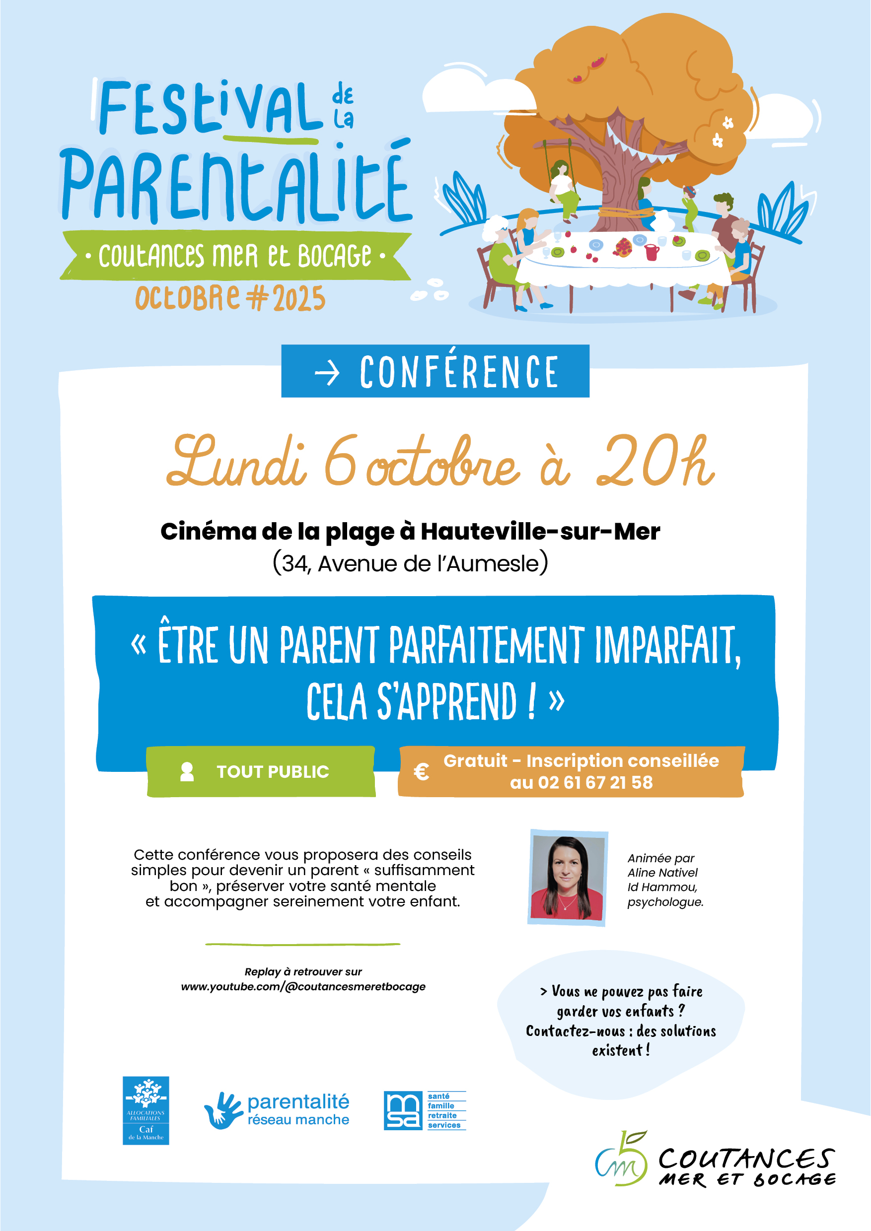 Dans le cadre du festival de la parentalité proposé sur Coutances mer et bocage au mois d’octobre, une conférence sera animée par Aline Nativel Id Hammou psychologue et auteure du livre “Le guide parfait du parent imparfait!“. Entre conseils (souvent contradictoires), les injonctions à être parfait, et la pression du quotidien…on peut vite se sentir dépassé.