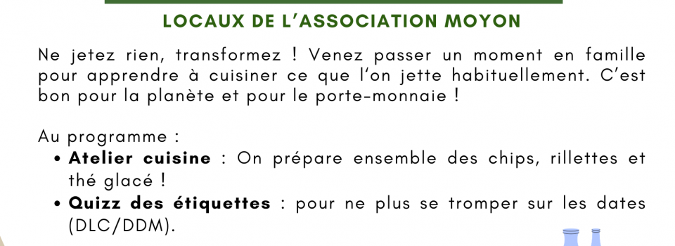 Cet atelier propose de découvrir des techniques pour utiliser les restes sans les jeter. Et aussi comment apprendre à décrypter les étiquettes avec toutes leurs petites lignes. Ceci en vue du bien être de notre santé mais aussi de celle de la planète. Car toute ressource est bonne à être utilisée. Ca vous tente ? inscrivez vous vite !